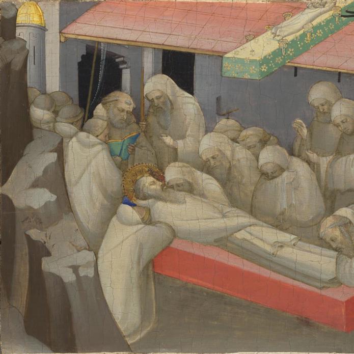 A glorious, glowing, multi-coloured company of saints and angels surround Christ and his mother as he delicately places a golden crown on her head, making her Queen of Heaven. This huge polyptych (multi-panelled altarpiece) was painted for the high altar of the monastery of San Benedetto fuori della Porta Pinti in Florence. It was originally even bigger: its main panels are in the National Gallery, but other parts are scattered in collections across the world.