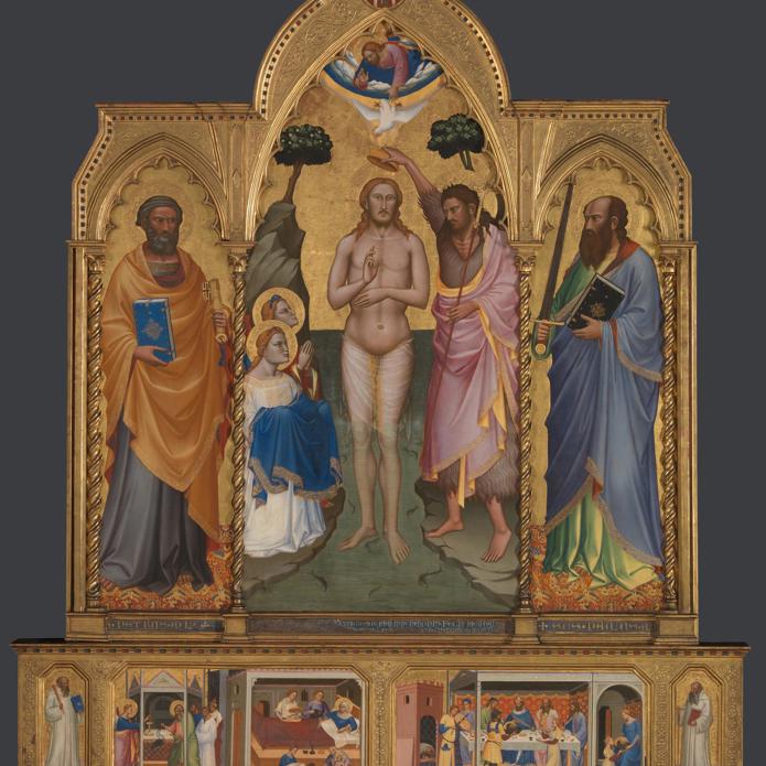 The three panels belonged to an altarpiece that was possibly made for the church of San Salvatore al Vescovo, the Bishop of Florence’s church, located within the Palazzo Arcivescovile. They are pinnacle panels – those appearing at the top, crowning the altarpiece. At some point before they entered the National Gallery, the panels were framed as part of the Baptism Altarpiece by Niccolò di Pietro Gerini. Originally, however, they belonged to a different altarpiece altogether. They have now been removed and are displayed separately.