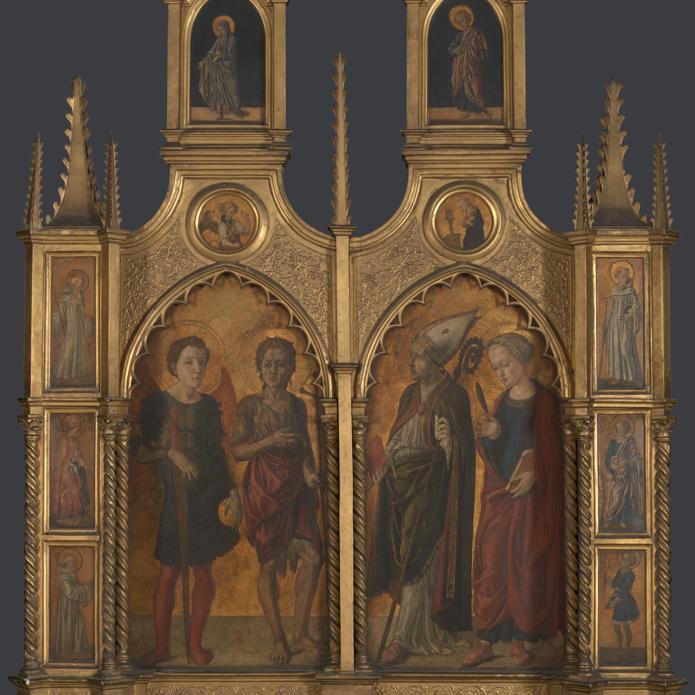 Two saints – one with wings leaning casually on a sword, the other wearing an animal skin – stand in a Gothic arch. On the left is Saint Michael the Archangel, leader of the heavenly army, with Saint John the Baptist on the right. They come from a polyptych (a multi-panelled altarpiece) painted in Florence around 1450 for the Camaldolese nunnery of San Giovanni Evangelista in Pratovecchio, Tuscany.