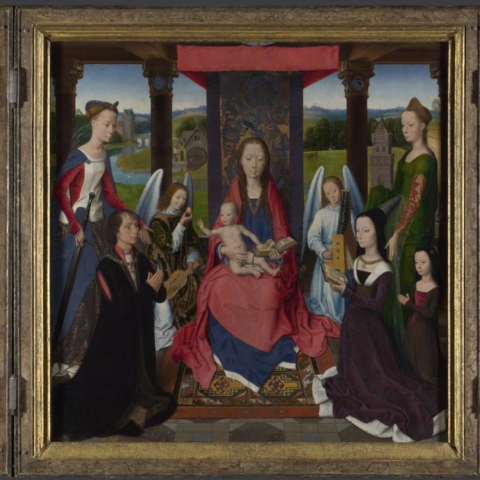 The younger son of a Welsh soldier, Donne was a career administrator who owed his fortune to King Edward IV. He and his wife wear the King’s livery collars. The composition is a version of Memling’s famous Triptych of the Two Saints John (Memling Museum, Bruges), which he worked on in the late 1470s. Perhaps Donne saw it in Memling’s workshop and asked for something similar.