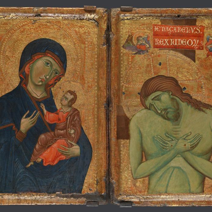 These panels once formed the left and right wing of a diptych, a painting made up of two parts joined by a central hinge. Holes on the left edge of the panel depicting the dead Christ match up with those at the right edge of the panel with the Virgin and Child; these once held hinges. Both panels have the same dimensions and the backgrounds are decorated with the same patterns and markings. The reverses are both painted to imitate red porphyry, a type of stone.
