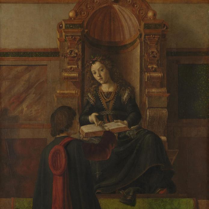A young man kneels before a richly dressed woman enthroned in a classical alcove, and looks at a portable organ sitting on the step beside him. She is an allegory of Music and, along with Rhetoric (National Gallery, London), was part of a series showing the seven liberal arts that was painted for Federico da Montelfeltro, Duke of Urbino.