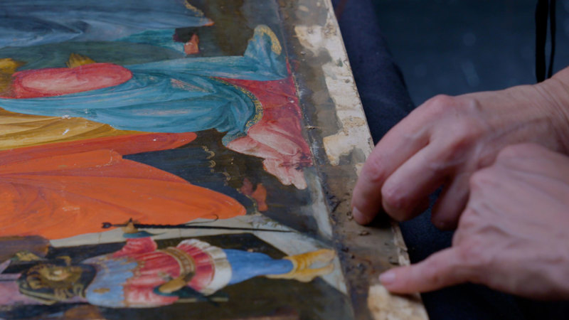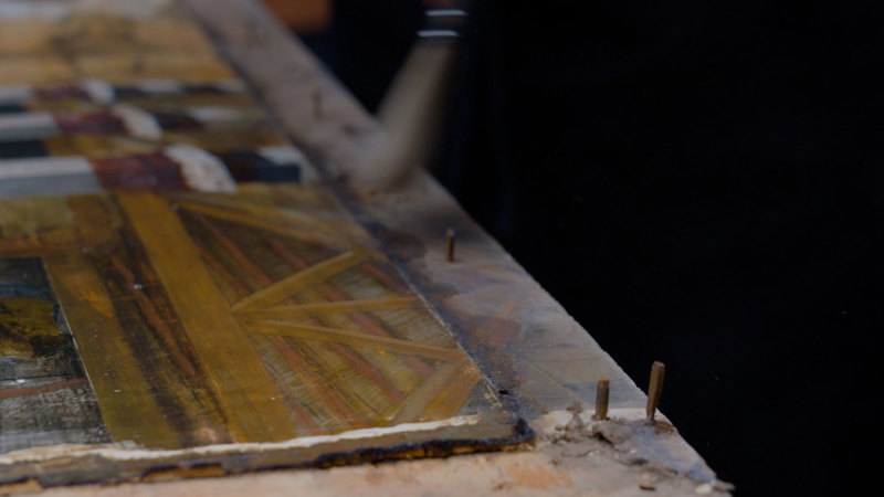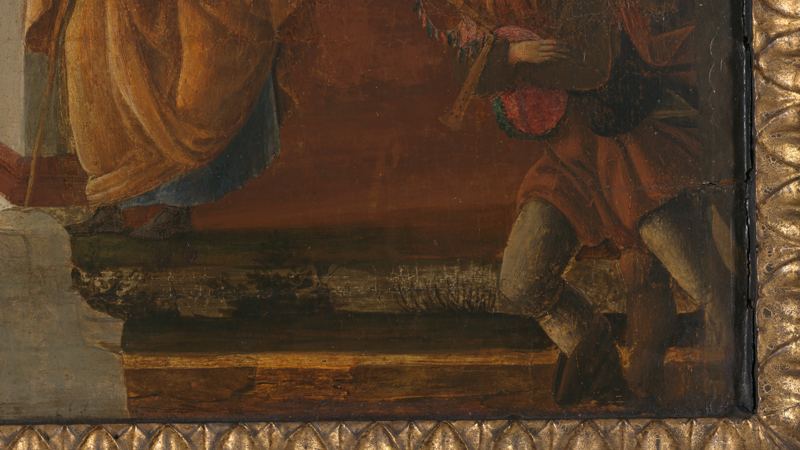 The removal of the frame confirmed that, along the lower edge, the painting was badly damaged, perhaps by water.