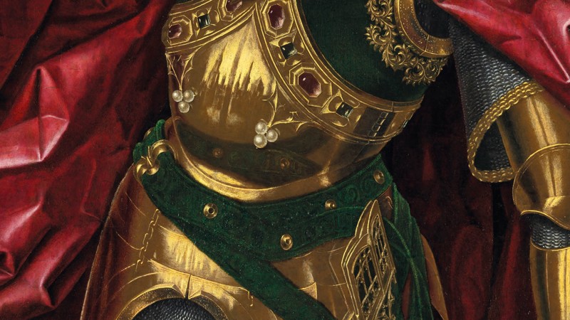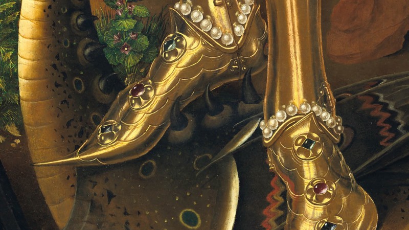 Saint Michael is dressed in an exquisite suit of tournament armour, made of gold and set with huge jewels, including lines of large pearls at the wrists and ankles.