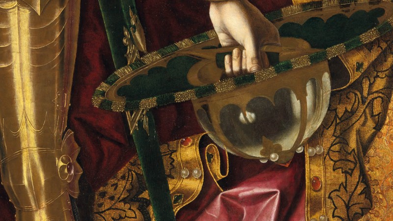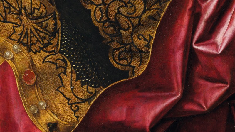 Saint Michael’s resplendent cloak of cloth gold and red lining takes up much of the canvas and is painted in incredible detail. For the gold brocade, Bermejo may have scored through gold leaf with a small semicircular tool to imitate the texture of the looped weave in the fabric.
