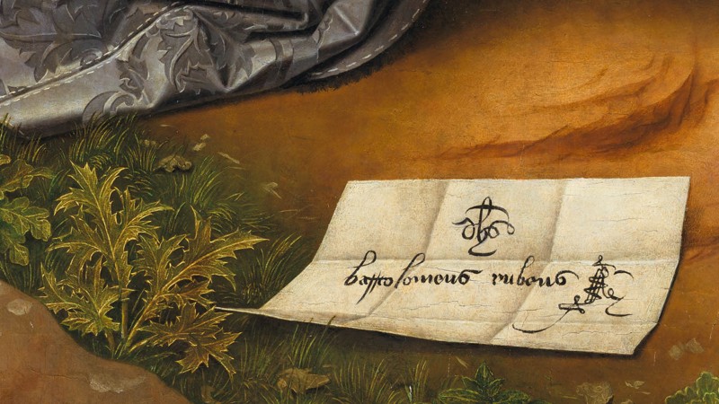 Bermejo has placed his signature prominently in the painting on a ‘cartellino’ – the fictive parchment – at the feet of the donor and Archangel. It reads ‘Bartolomeus Rubeus’, 'rubeus' being the Latin equivalent of 'Bermejo', meaning reddish.
