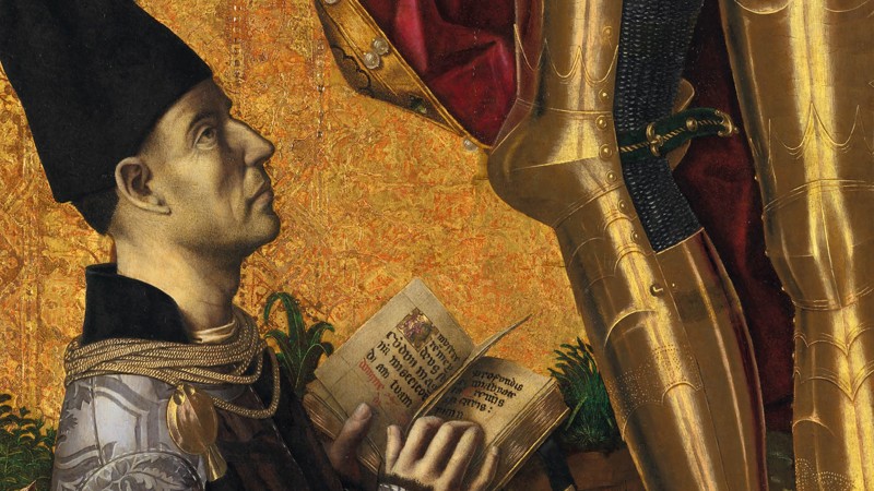 In contrast, the donor, Antoni Joan (who commissioned and financed the painting) has a naturalistic face. Here is a real man with wrinkles, stubble and a distinctive kink in his nose. It is clear that he and Saint Michael are from different worlds. Joan's sword and heavy chains indicate that he is a knight, and he holds open a book of Psalms.