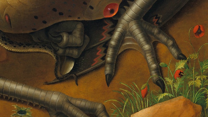 In the 15th century, as now, poppies were associated with death. Bermejo has positioned them emphatically next to the devil.