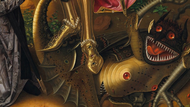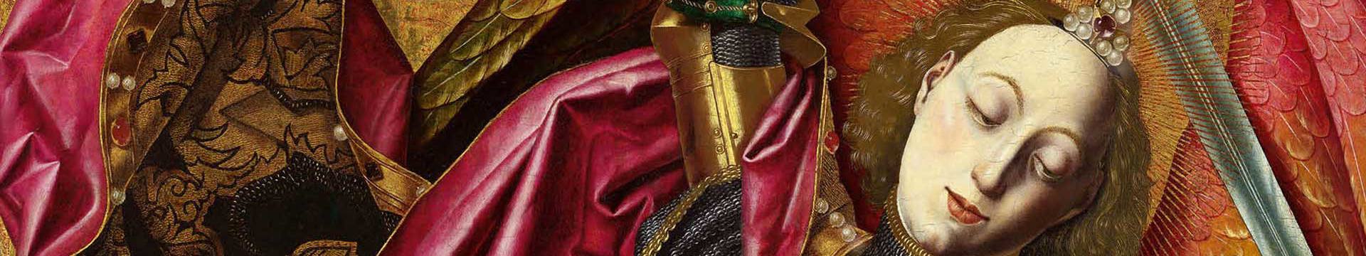 Saint Michael was an Archangel, the highest order of angels. Bermejo conveys his heavenly qualities: his graceful, feathered wings and billowing cloak fill the canvas and give the slender saint a volume and presence that he would not otherwise have. His face is idealised – he has a serene expression, without a trace of effort or fear.