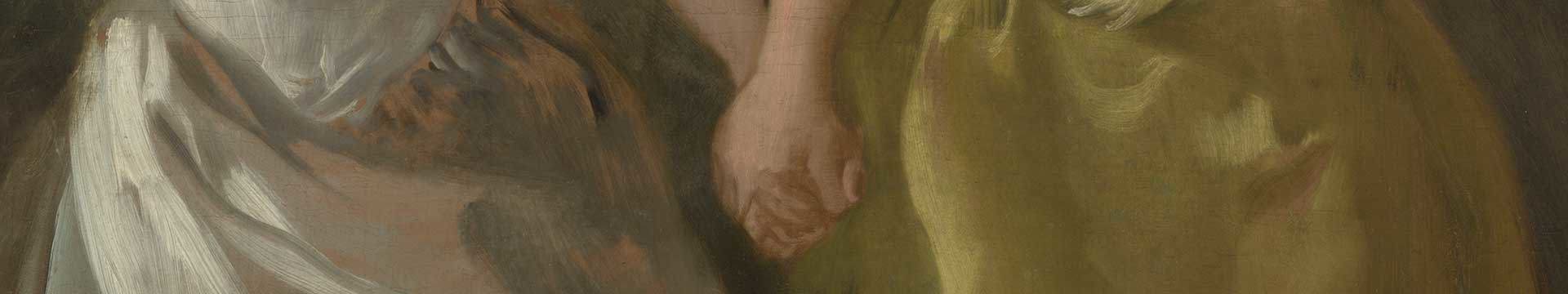 This marriage portrait shows the couple in fashionable dress taking a stroll in a romanticised setting. The feathery brushwork adds a sense of movement through the slanting strokes in the sky and foliage. Van Dyck’s influence can be seen in the delicate harmony of the couple’s poses and gestures, and in the predominance of black with a hint of white in one costume, which is then reversed in the other. Equally, Gainsborough increasingly applied thin paint layers in a ‘hatching’ manner, a technique then firmly associated with Van Dyck and Rubens.