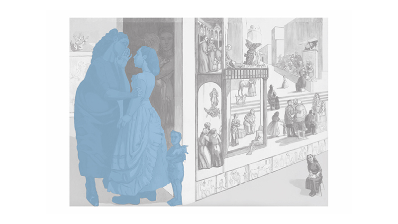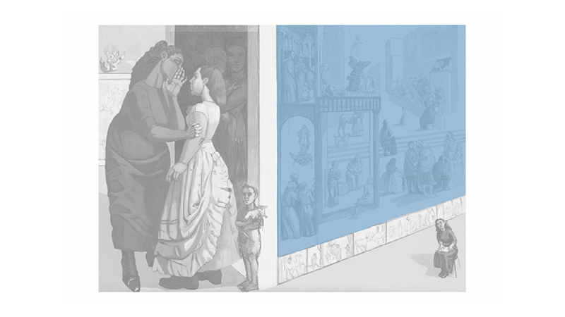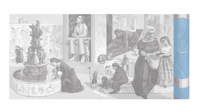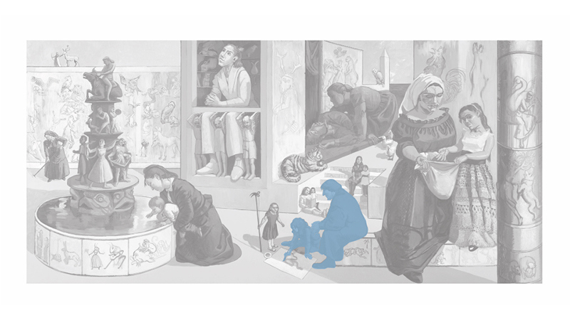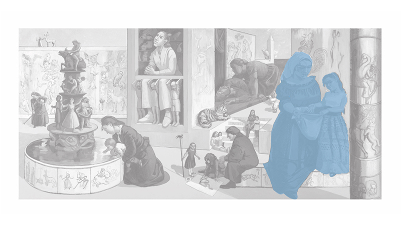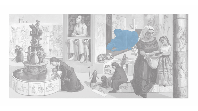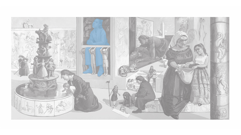 The figure of the Storyteller is based on the likeness of Erika Langmuir, Head of Learning at the National Gallery when Rego was Associate Artist. She peers over a young girl drawing a snake, who is based on Langmuir’s junior colleague, Ailsa Bhattacharya.