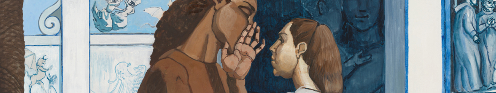 In Rego’s version of the Visitation, the Virgin Mary and her cousin Elizabeth, both pregnant with Christ and John the Baptist respectively, exclude the viewer from their conversation. Elizabeth grasps Mary’s upper arm with one hand and shields her own mouth with the other, hiding their discussion. Disrupting any sense of linear time, saint John also features in front of them as a young boy holding a lamb, and a faint image of Mary holding the baby Christ appears on the wall behind them.