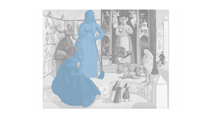 Saint Martha is shown diligently sweeping the floor in a long white dress, while Mary Magdalene sits in contemplation at her feet, herself dressed in a black dress with a voluminous skirt.