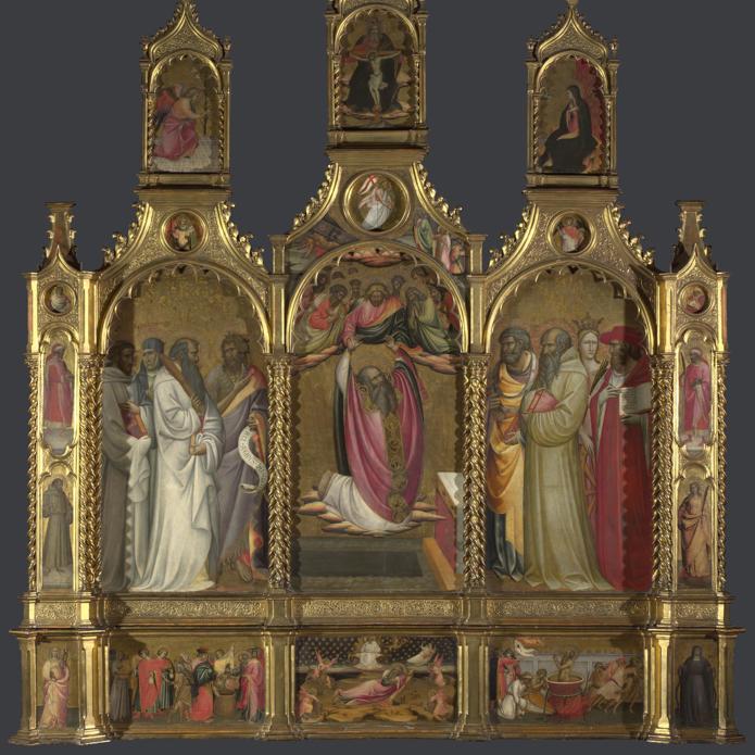 This large, gilded polyptych (multi-panelled altarpiece) is one of the few almost complete early Renaissance altarpieces in the National Gallery’s collection. It was made for the church of San Giovanni Evangelista, in Pratovecchio, Tuscany, probably in the 1420s.