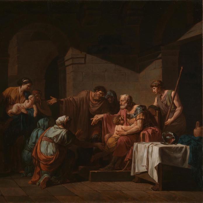 The painting represents an episode in Belisaire, a novel by Jean-François Marmontel, published in 1767. The novel is based on the legend of Belisarius, the Byzantine general (about 505–565) who according to this account was blinded and impoverished by the Roman emperor Justinian. Peyron depicts the episode when Belisarius is given hospitality at the home of a peasant who recognises the hero fallen on hard times. The two women of the family place their infants on his knee to give him thanks and receive his blessing. The peasant’s son looks away from his wife and child as he contemplates his former general. Peyron uses contrasting light and shade and different spaces to underline the emotional conflict.