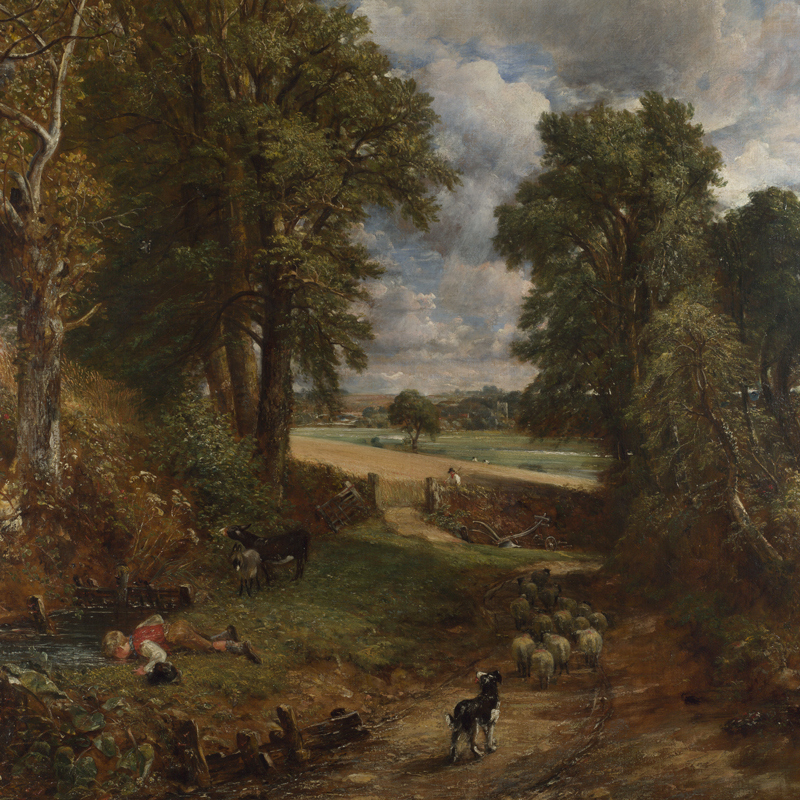 A boy has paused from the thirsty work of herding sheep at noon to lie flat on the bank of a pool and drink its cool water. This vision of a Suffolk lane in high summer was painted in January to March 1826 in Constable’s studio in London. The lane winding into the cornfield is based on Fen Lane, along which Constable had often walked as a boy from his own village of East Bergholt to Dedham, where he attended school. The lane still exists but the countryside shown beyond it was largely invented.