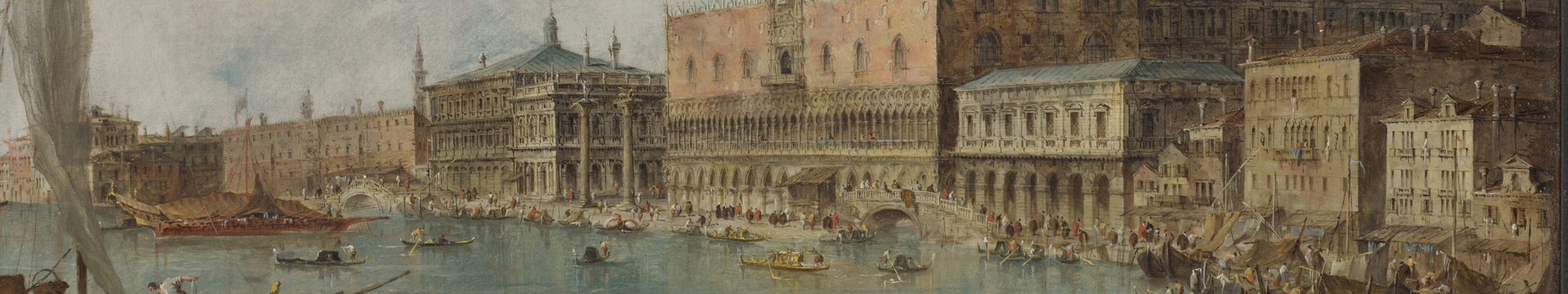 In the distance, the Doge’s galley stands out from the other vessels with its gold and red awning, marking the importance of the Venetian head of state. The gondoliers take centre stage, making their living as they ferry passengers across the water. These passengers line-up to wait along the Molo – much as contemporary visitors do today.