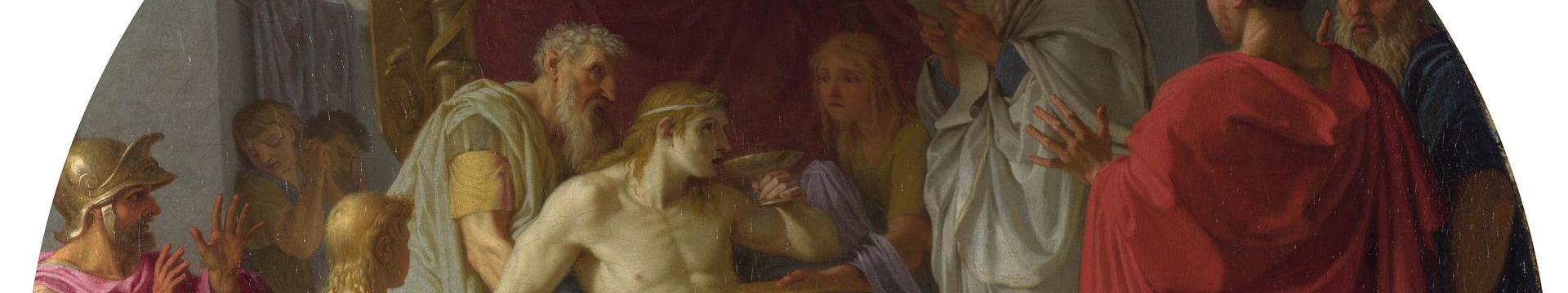 Is he guilty? Hands raised in horror, eyes widened, their companions wait to discover the truth. Alexander, who recovers, looks up at Philip to acknowledge his innocence and loyalty.