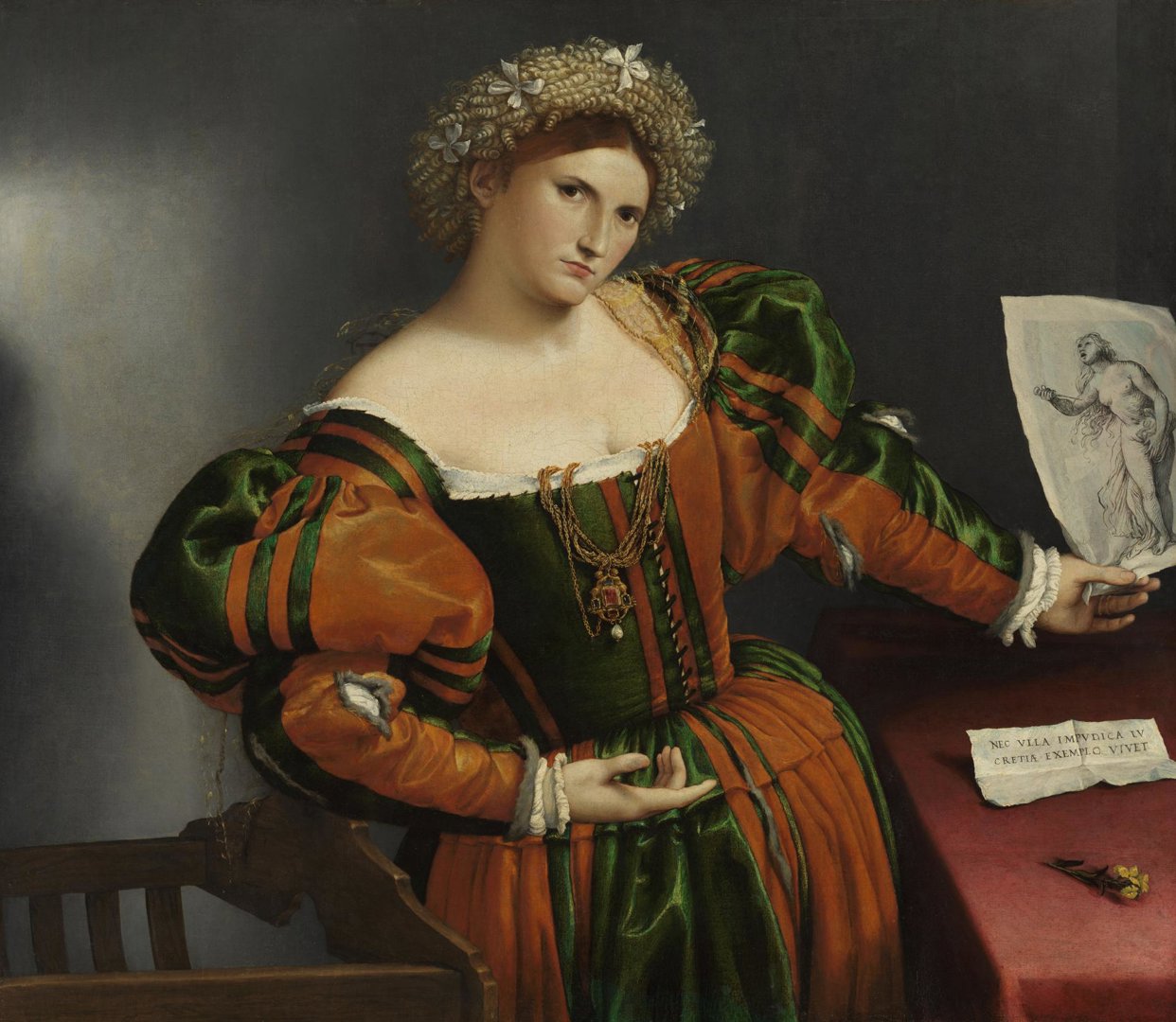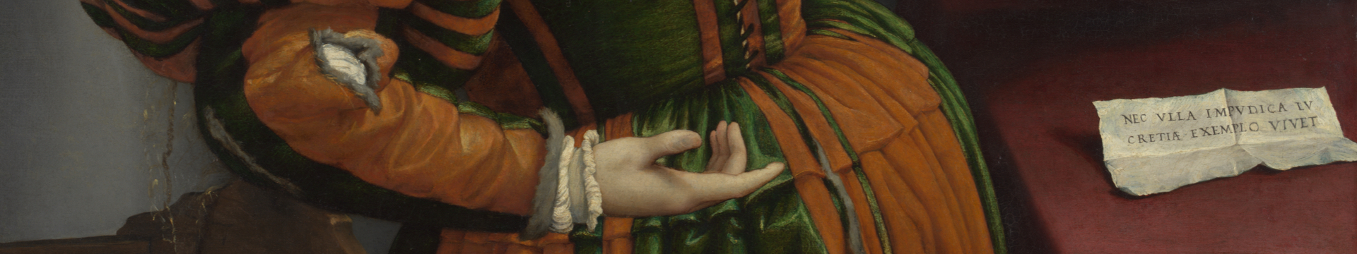 She holds an ink drawing of the Roman heroine Lucretia who stabbed herself with a dagger after being raped to preserve her family’s honour. In the 15th and 16th centuries, Lucretia was celebrated as an exemplary figure of chastity and wifely virtue. The sitter was perhaps called Lucretia and portrayed in the guise of her allegorical namesake, as was common with such portraiture at the time.