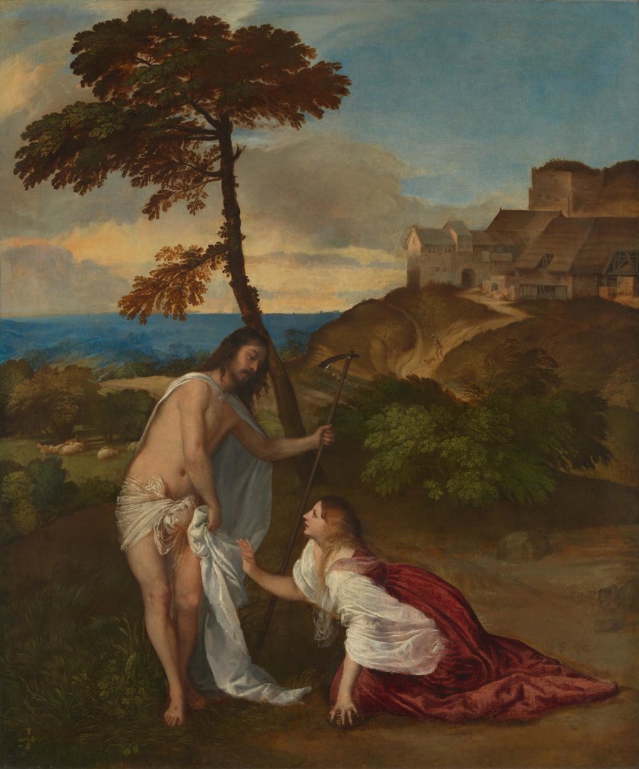 Titian plays on the juxtaposition of female sensuality and sanctity combined in the figure of the Mary Magdalene. Her exposed arms, unbound hair and loosened veil add a heightened eroticism, as does Christ’s partially nude form. However, this sensuality is part of the spiritual intensity of their encounter. At the moment that Mary Magdalene yearns to embrace Christ, she realises this will only be possible once she too transcends her physical form.