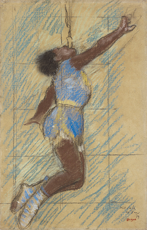 Among all other works shown at the 4th Impressionist Exhibition in Paris in April 1879, the painting is no doubt one of the most uncompromisingly daring and modern. A significant ensemble of Degas’s preparatory drawings, reunited for this exhibition, shows him at work, observing and sketching this remarkably talented sitter. These include a large drawing of Miss La La – last published over a hundred years ago – with her profile delineated three times. In addition, two newly discovered, unpublished drawing by Degas are displayed: a rare sketch of Miss La La depicted against the circus architecture, hanging from its vertiginous rafters and an entirely unknown drawing of her stage partner Theophilia, from the ‘Miss La La and the Kaira Troupe’, also posing for Degas.