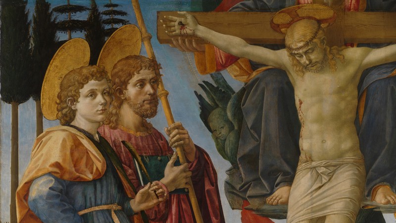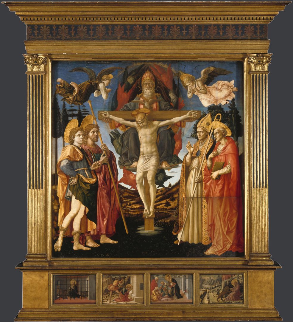 From the domestic to the divine, the 'Pistoia Trinity Altarpiece' is one of only two large-scale altarpieces Pesellino is known to have produced. Left unfinished at his death, it was completed in the workshop of Filippo Lippi, for whom Pesellino had completed a predella for the Novitiate chapel in Santa Croce 15 years earlier. This is the earliest 'pala' (an altarpiece with a single main panel) in the National Gallery. As one of the few nearly complete altarpieces in the collection, the work reveals much about Pesellino’s posthumous reputation.