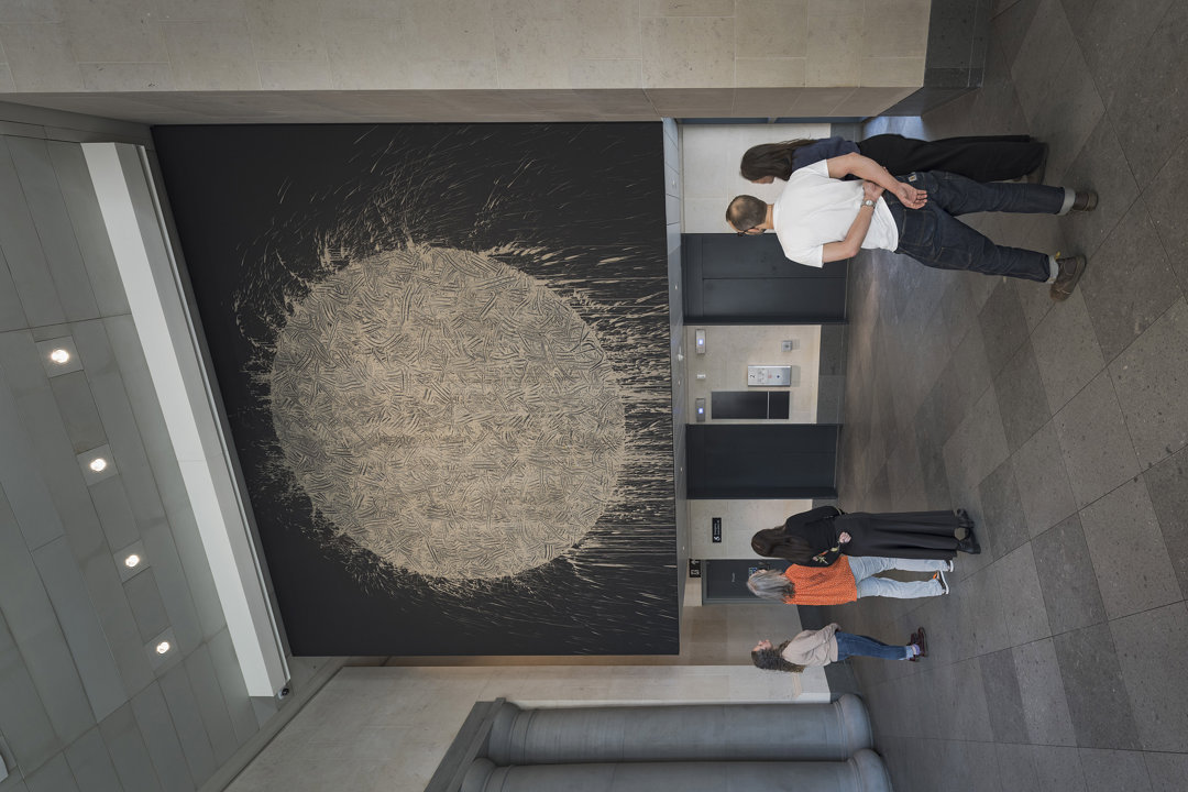 Dramatically situated at the top of the grand staircase of the newly transformed Sainsbury Wing, 'Mud Sun' is a monumental, site-specific work, created by hand from tidal mud of the River Avon, close to the artist’s home.