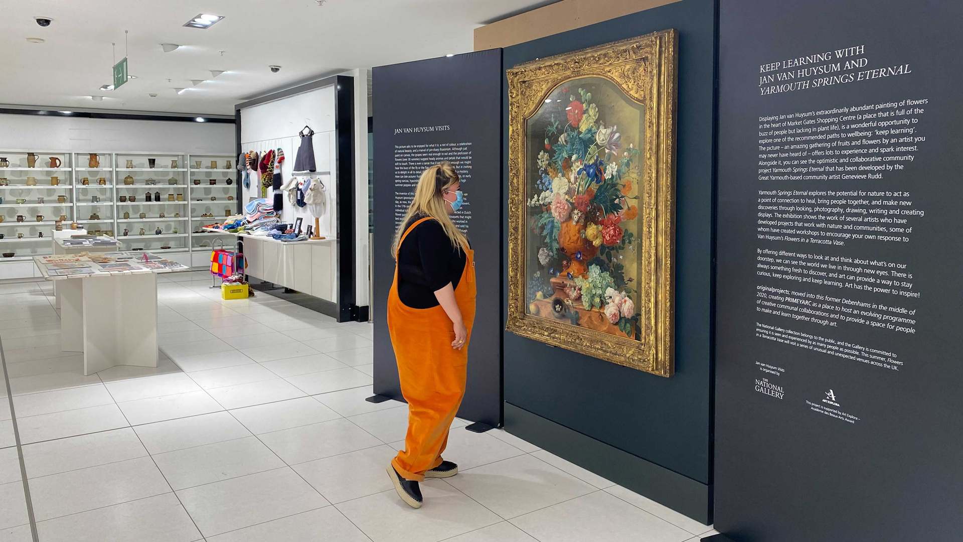 Today (Tuesday 1 June 2021) marks the beginning of the National Gallery’s touring exhibition Jan van Huysum Visits, with Jan Van Huysum’s magnificent Flowers in a Terracotta Vase (1736–7) going on display at PRIMEYARC, Great Yarmouth, a community art space which was formerly the department store Debenhams.