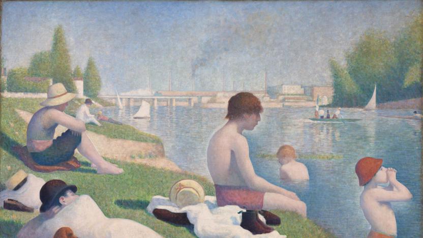 The painting features seven seemingly male figures, some dressed, some in swim wear. Five are lounging on the bank of the river Seine on a warm, sunny day, the other two in the water.