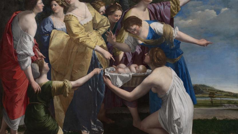 This version was commissioned by King Charles I and Queen Henrietta Maria, of Great Britain and Ireland, to celebrate the birth of their son – the future Charles II. So instead of the story being set in Ancient Egypt, Gentileschi has transported it to the Stuart Court, with the baby representing both Moses, the future leader of his people, and also the new royal heir. The painting would have originally hung in the Queen’s House in Greenwich, to the left-hand side of a large window, giving the impression that the women pointing into the distance were gesturing not to the Nile, but to the River Thames.