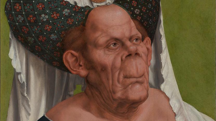 We do not know the identity of this woman, although Massys' extraordinary rendering brings her to life, as if at any minute she will open her lips and speak. There has been speculation that Massys has painted a woman who has Paget's disease, a condition which causes facial differences. Another theory is that she is a character from the world of folklore and carnival. This kind of lavishly dressed old woman also features in several prints, miniatures, and church carvings of the period. The painting may well have been paired with that of an older man, now in a private collection in New York, but we have no documentation to prove this. It is clear, however, that she was an object of fascination for the artist, who, like his contemporary Leonardo da Vinci, was intrigued by those with extreme and unusual features. Both artists made a large number of sketches and prints of people which they called grotesques, which were popular with the public at the time.