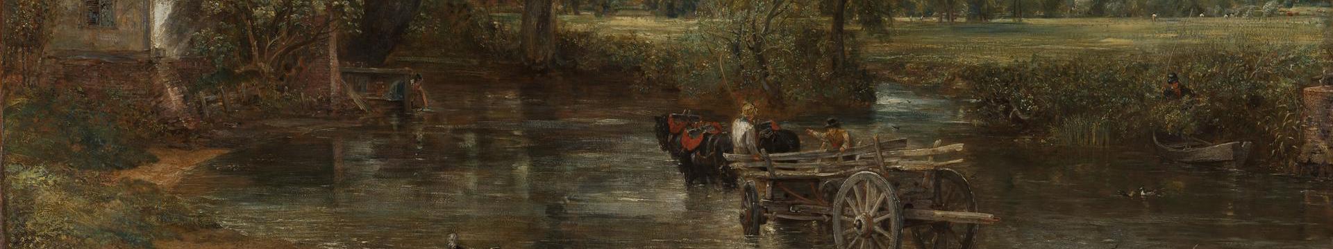 'The Hay Wain' is one of the most popular paintings in the National Gallery. Painted in 1821 by the English landscape artist, John Constable, the view is of the millpond at Flatford on the River Stour. Flatford Mill was a watermill for grinding corn, operated by Constable's, family for nearly a hundred years. The painting's title, 'The Hay Wain', refers to the wooden wagon (wain) used for transporting cut and dried meadow grass (hay).