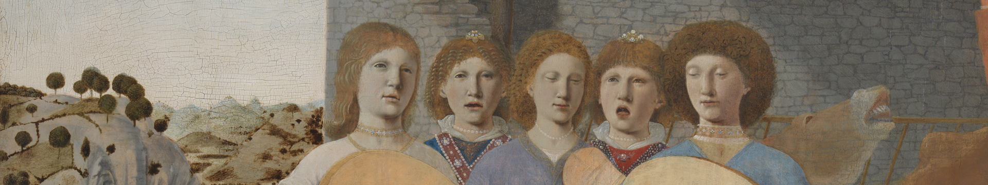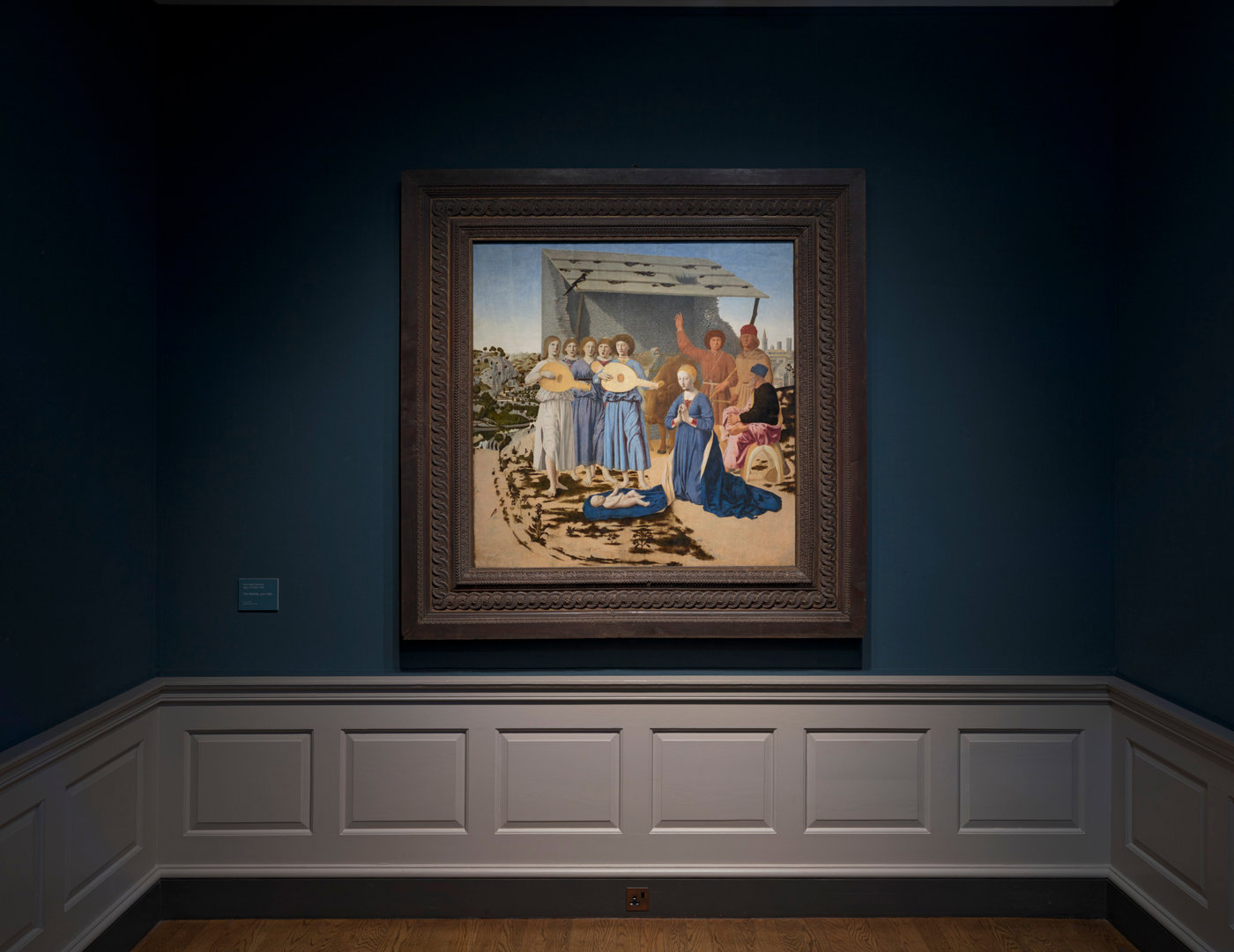 Piero sets the scene within a tranquil Tuscan landscape recalling the surroundings of his hometown. The Virgin Mary kneels before Christ, her cloak spread to protect his new-born skin from the bare earth. Behind the Virgin are two shepherds, while Joseph, her husband, is seated on a donkey’s saddle. A group of music-making angels provide a heavenly accompaniment to this otherwise rustic scene.
