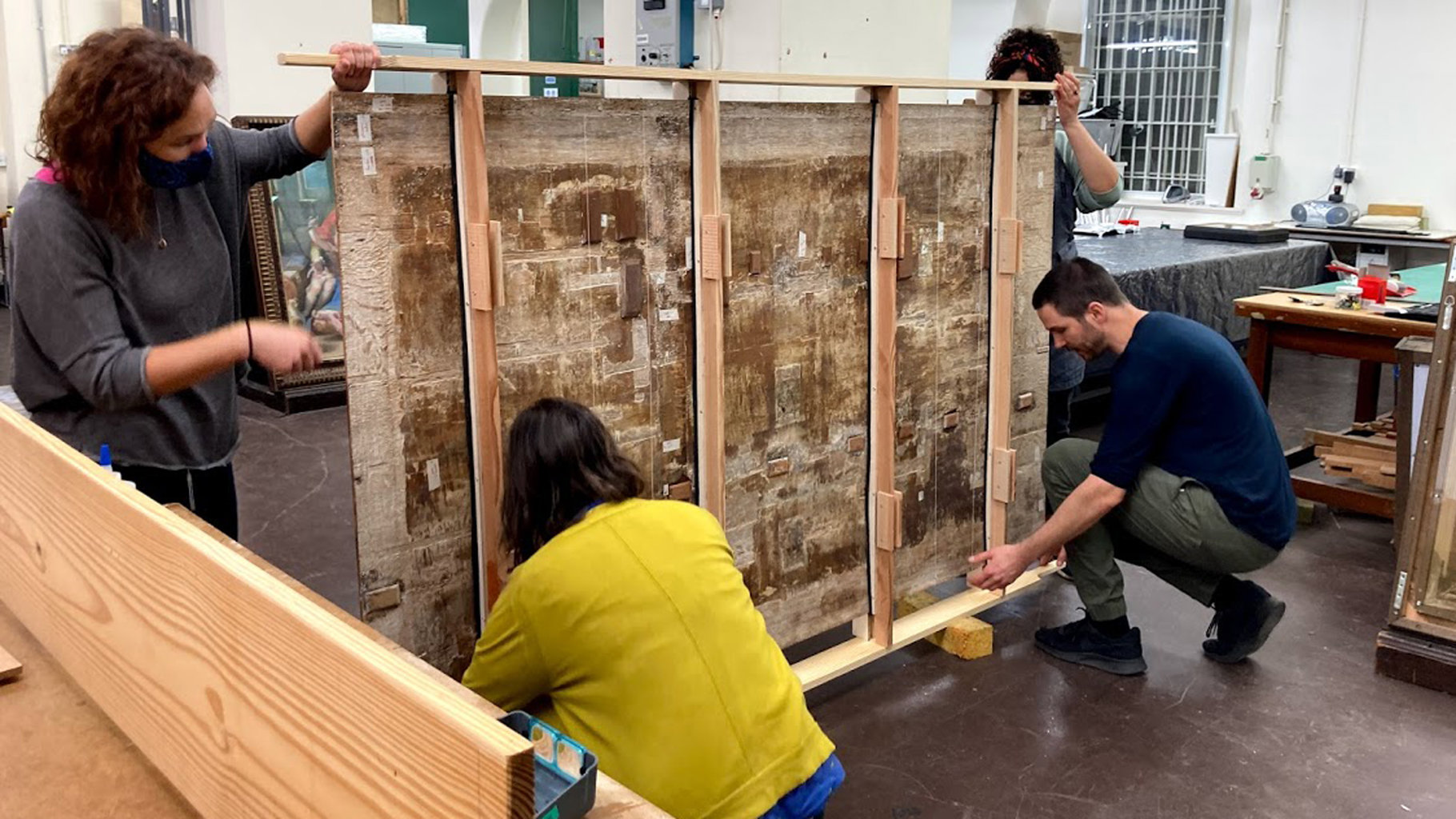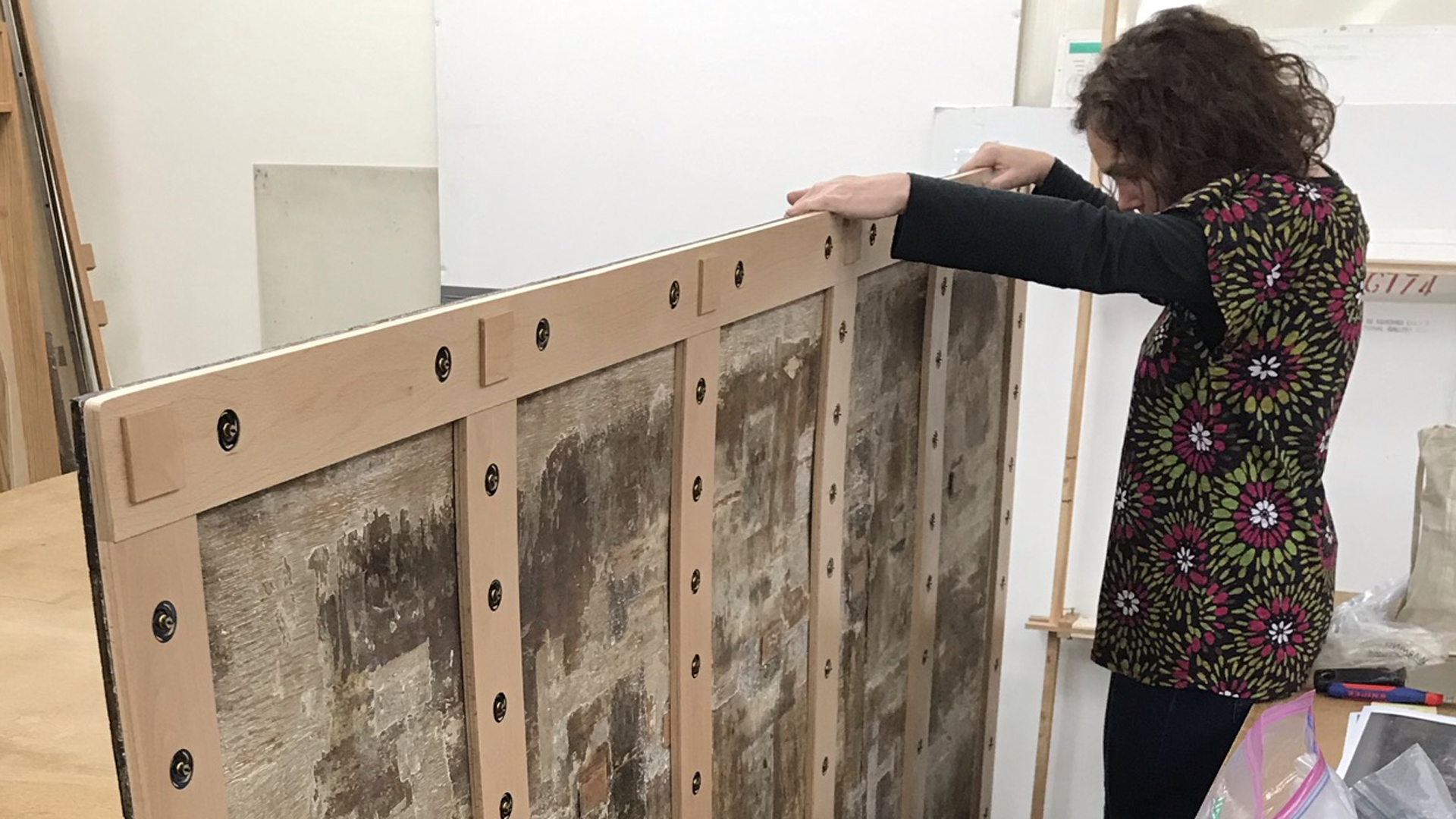 The support was designed taking into account the placement of the different boards of the panel and the various damages, and so that it would be possible to continue to examine the construction evidence on the reverse without removing it.