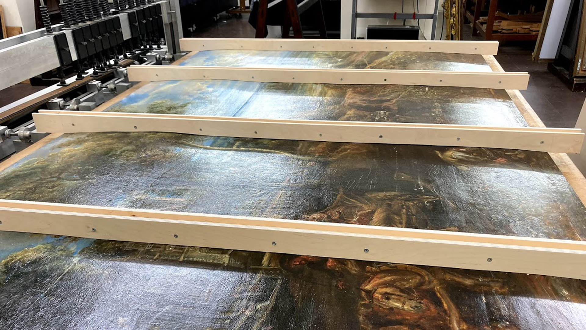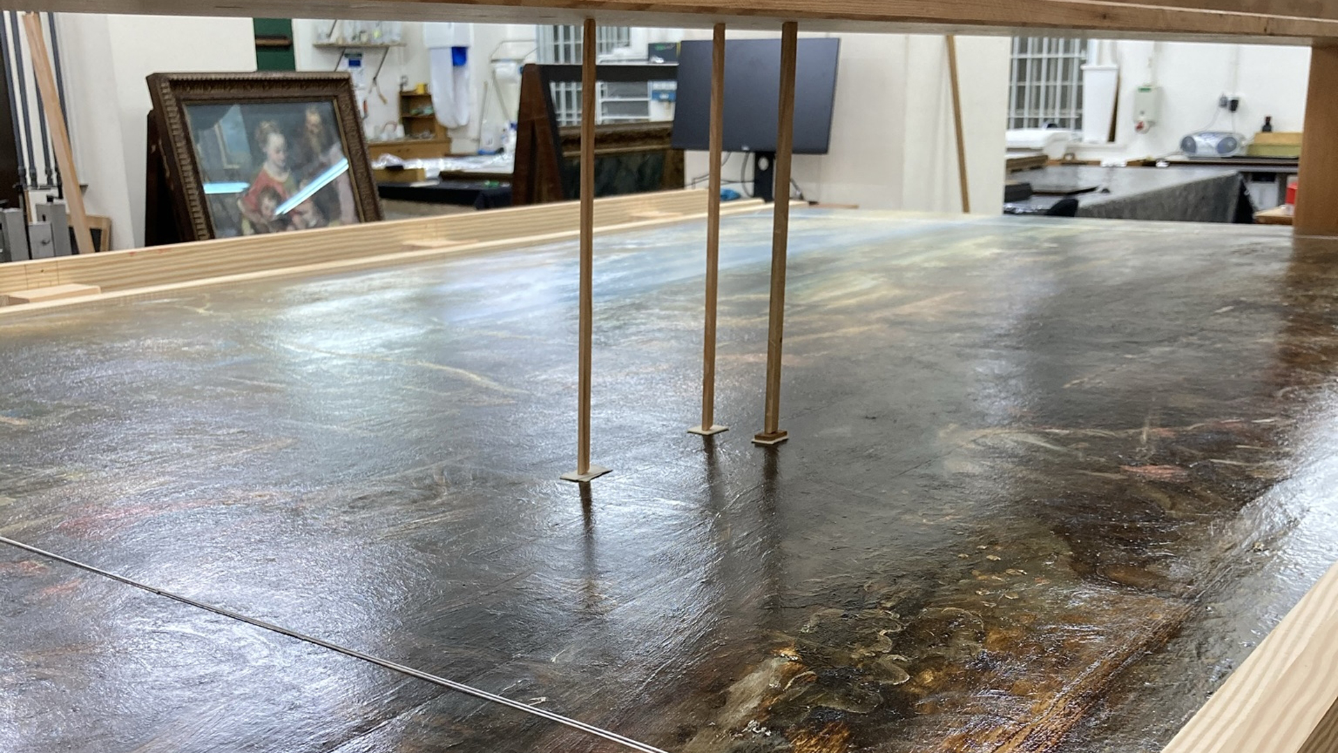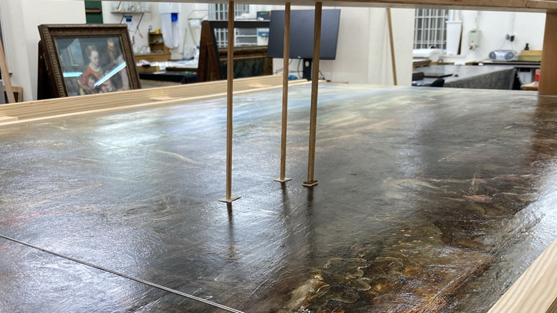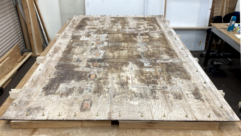 The open splits and board joins were re-aligned and re-glued so that the paint film was level on the front, and improvements were made to wide concave deformations.