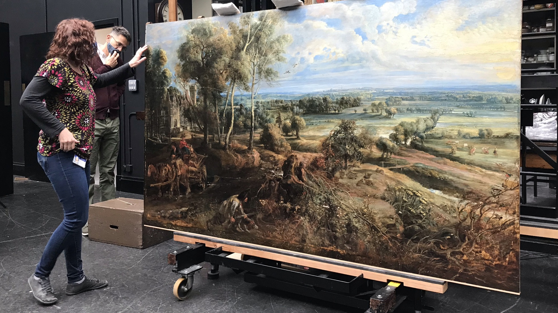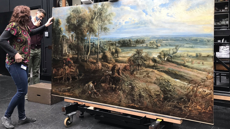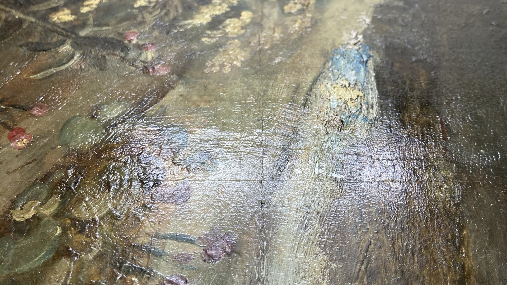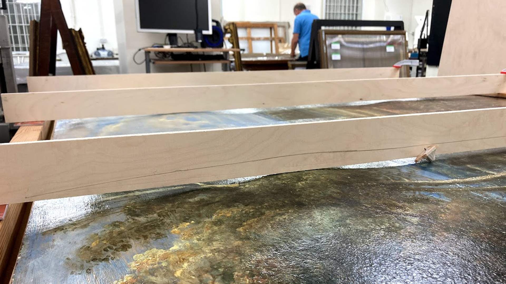 The open splits and board joins were re-aligned and re-glued so that the paint film was level on the front, and improvements were made to wide concave deformations.