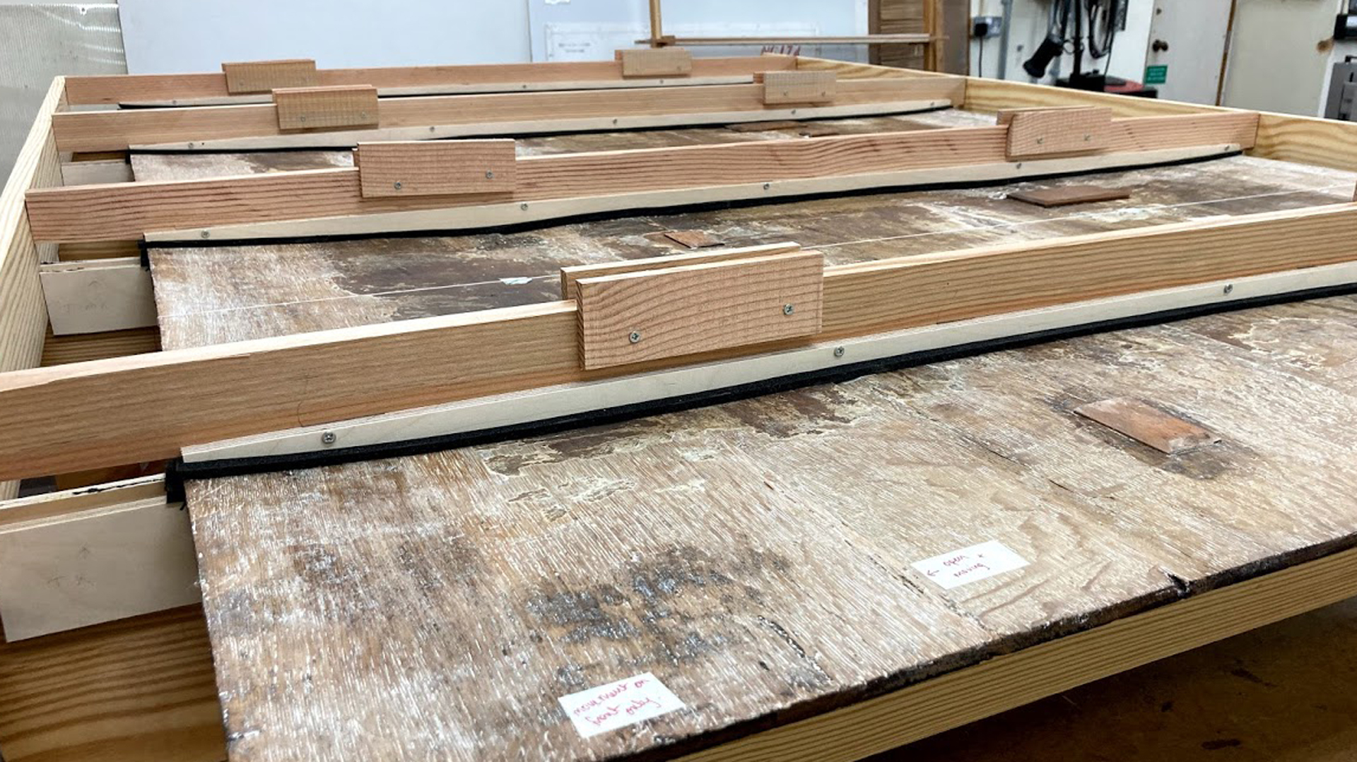The reverse of the temporary support with profiled battens.