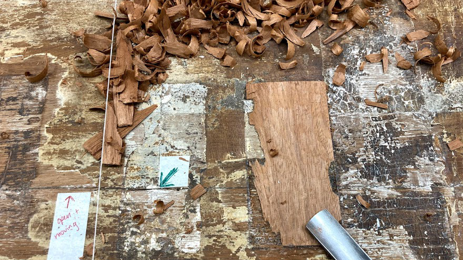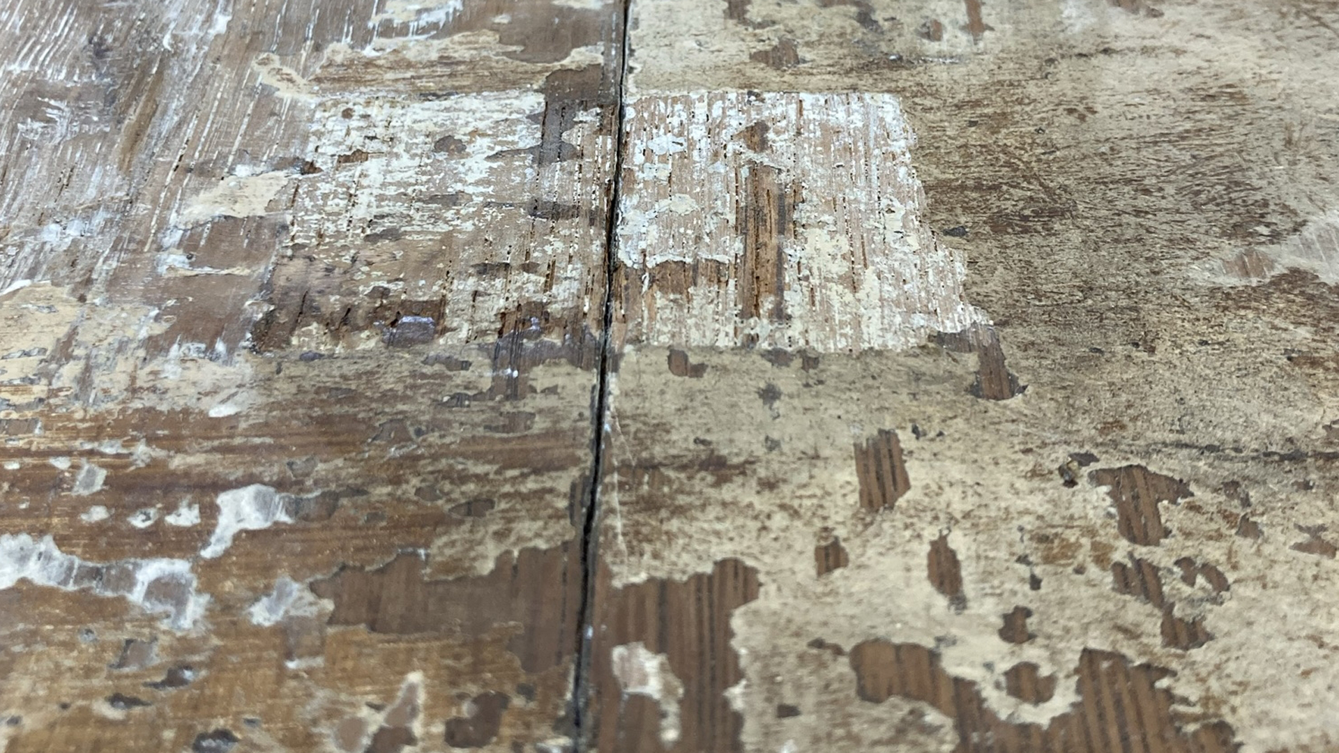 This image shows the reverse of one of the board joins that had opened up over time. It was much more open and visible on the reverse than on the front. Also visible are the remnants of the original chalk coating.