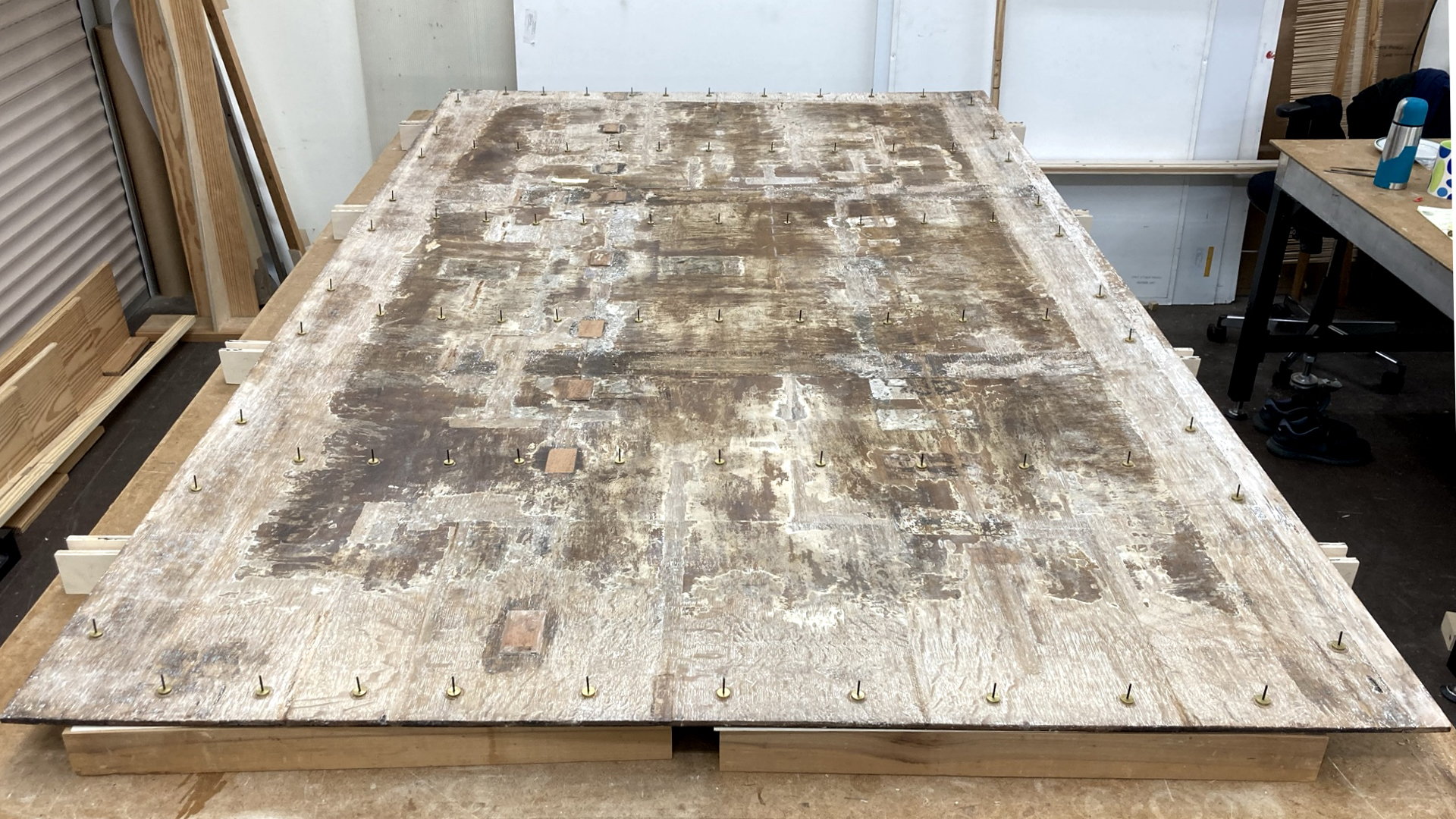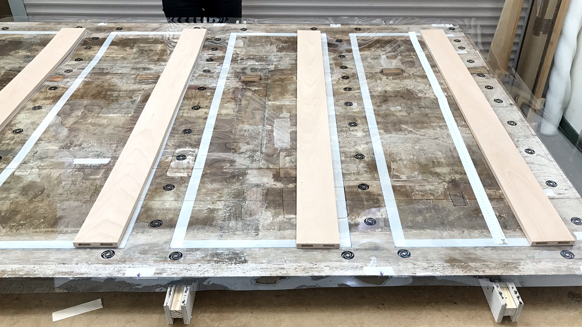 Using a transparent sheet marked up with the board joins and repairs, the positions of the concentric tensioners, the attachments for the secondary support, were considered.