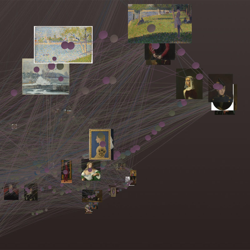 ‘Dreaming’ is a playful and charming interactive experience that takes a meandering journey through the dense web of information about our collection; drawing associations between paintings, from their compositions and visual comparisons, as well as their factual relationships.