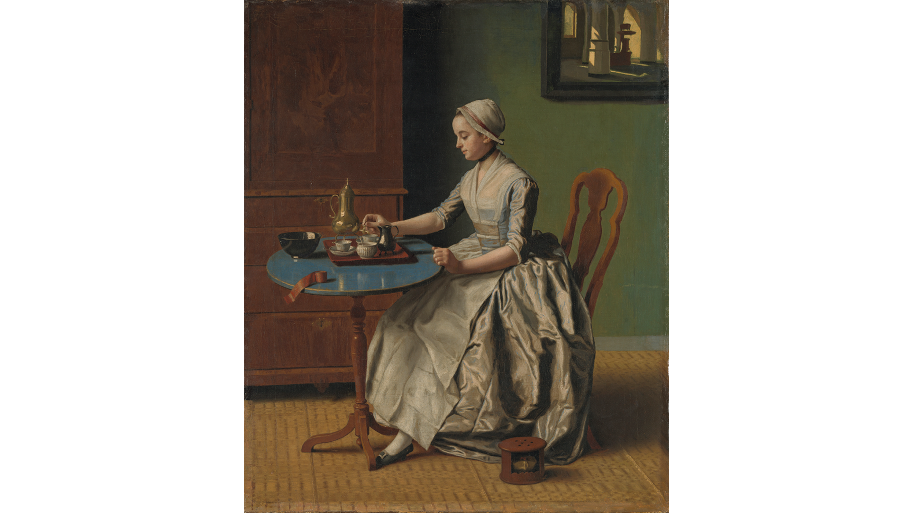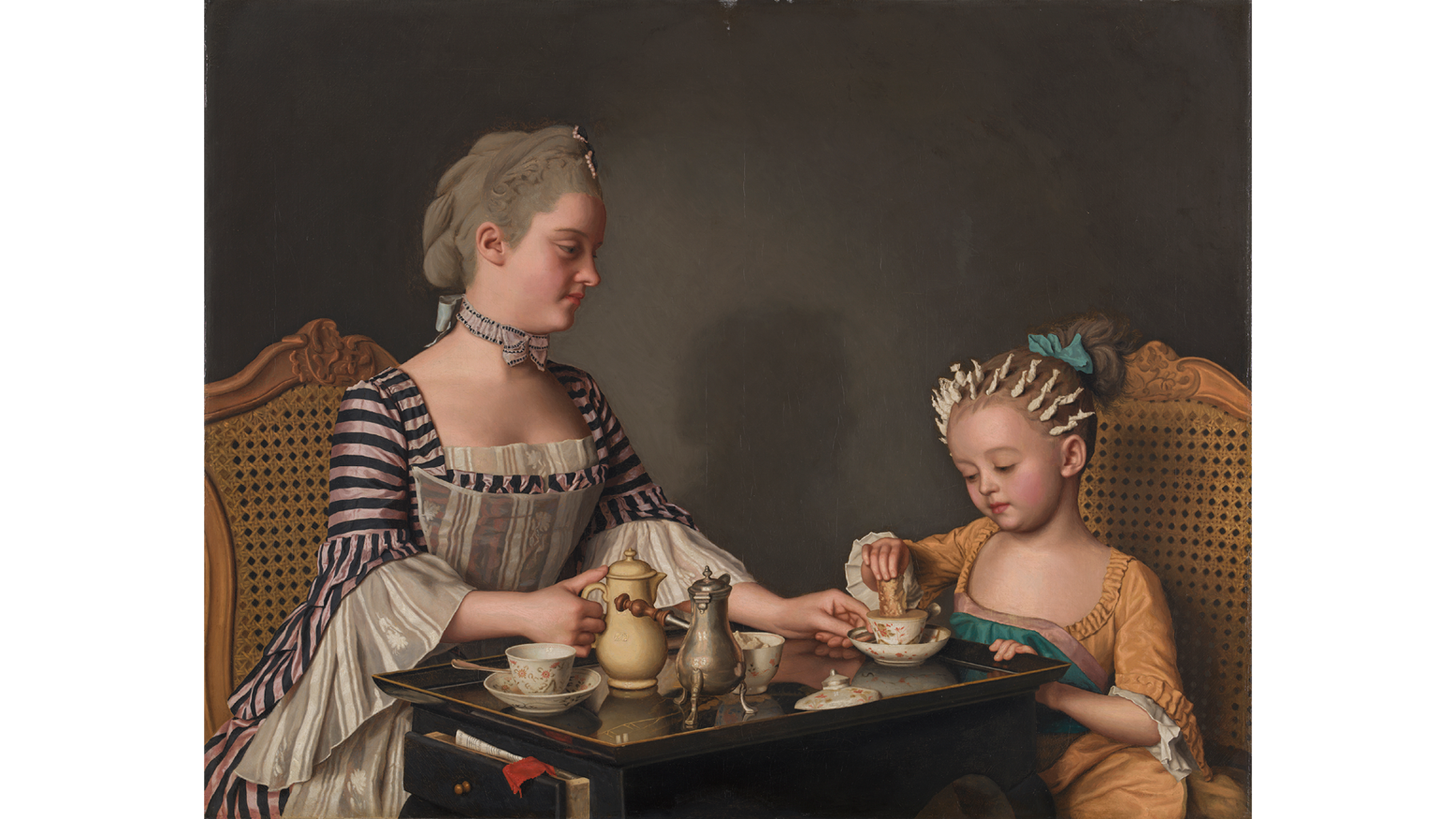 Long regarded as his masterpiece, The Lavergne Family Breakfast is one of Liotard’s largest and most ambitious works in pastel. Despite the medium’s notorious delicacy, he skilfully reproduces complex textures: the sheen on the metal coffee pot, the shiny ceramic jug, the silky fabrics and reflections, in the black lacquer tray. Liotard was extremely versatile, producing works in pastel, oil, enamel, chalk and even on glass. Highly unusually, he returned to ‘The Lavergne Family Breakfast’ 20 years after he had painted it and made an exact replica in oil.