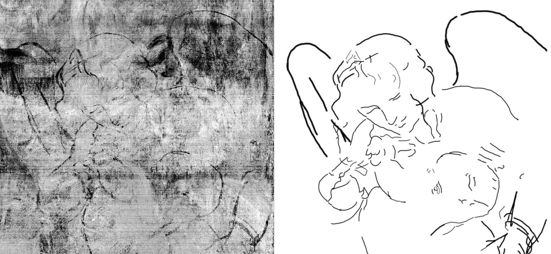 New imaging has revealed Leonardo’s earlier design for the angel and baby Christ, which show significant differences to how they look in the finished painting. In the composition that was drawn first, both figures appear higher up, while the angel, facing out, is looking down on the baby Christ with what appears to be a much tighter embrace.