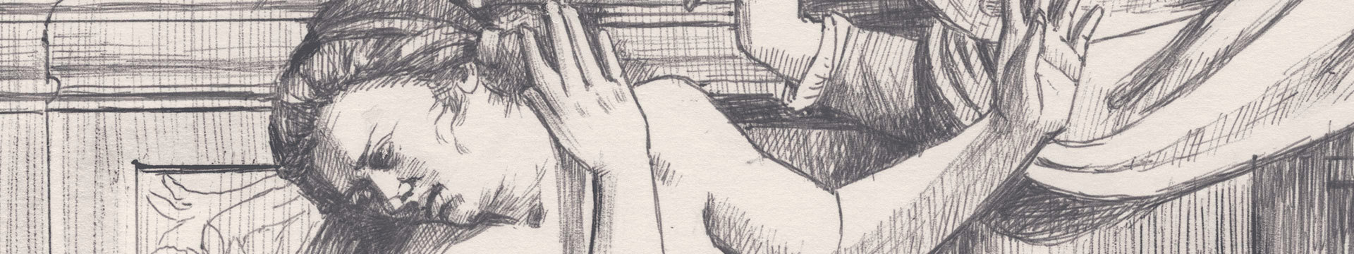 LT: In the flesh, Artemisia’s paintings are incredibly strong – the figures are generally life-size, the lighting dramatic and she uses a bold, rich colour palette. Somehow, you’ve managed to convey an equally forceful presence in your drawings, even though they are relatively small in scale and exclusively in monochrome. Did you ever consider producing your novel in colour?