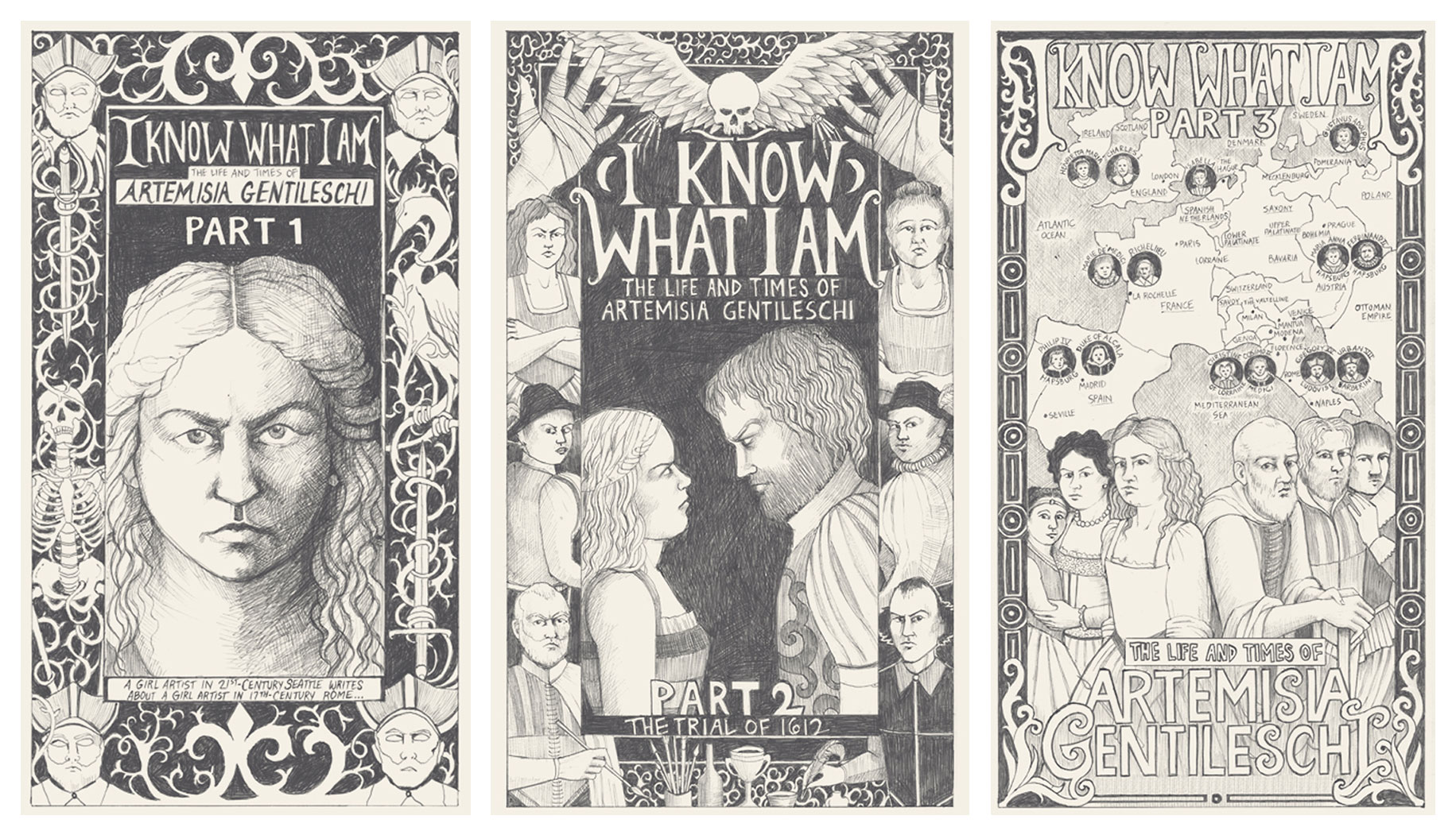Meticulously rendered in ballpoint pen, 'I Know What I Am' weaves Artemisia’s artworks with her life story, the politics of art patronage and religious turmoil of her times.