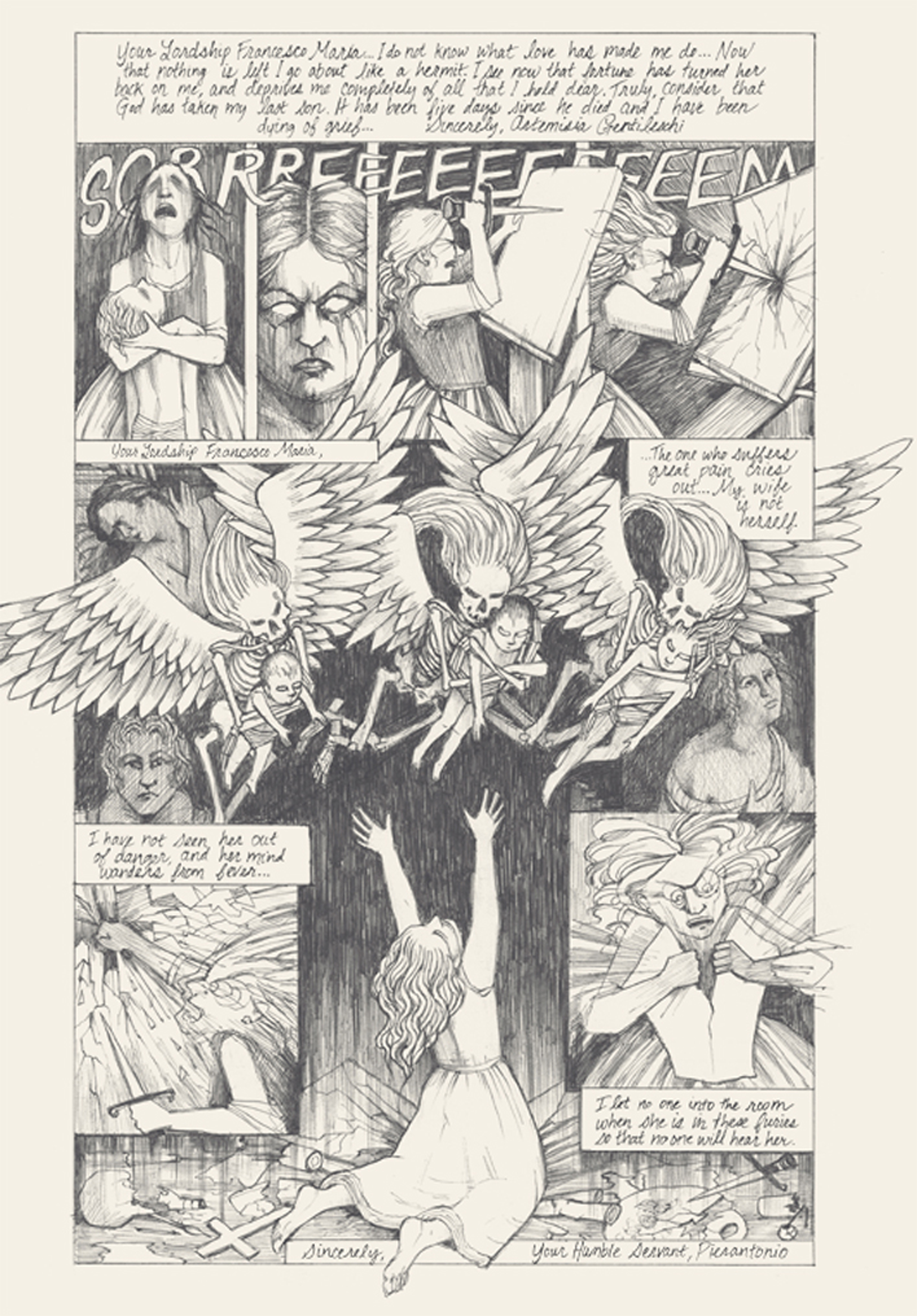 LT: One of the things I find most compelling – and most successful – about your book is the balance between words and images (be they drawings of Artemisia and the characters in her life, or drawings after her paintings). How did you decide what to put into words and what to convey in pictures?