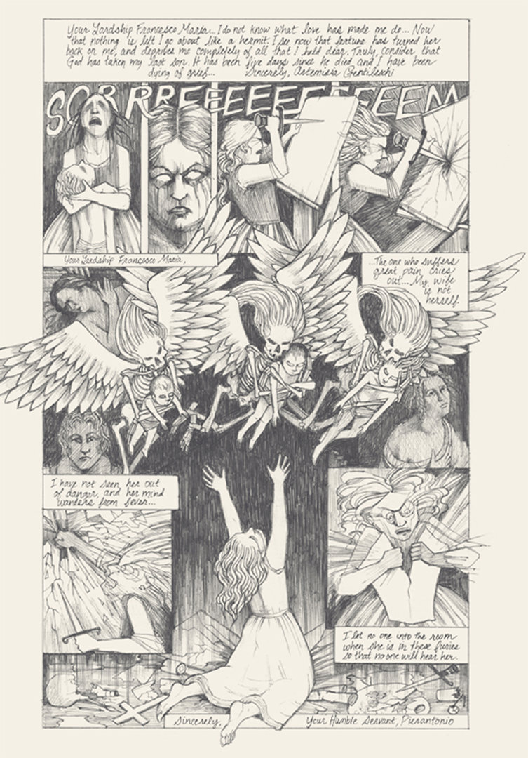 GS: Choosing what to draw and what to write is one of the fundamental challenges for anyone making comics. It means communicating in two languages simultaneously. Each page has its own criteria that must be met. So many factors go into these decisions. Sometimes it’s gut instinct. For instance, the page where Artemisia discovers that Prudenzia is her one surviving child – it just felt right to strip away the text and let the reader be there with Artemisia in her darkest moments, with those black panels and minimal design. Some of these decisions have to do with time and pacing, figuring out how much space to allocate to each different episode and aspect of Artemisia’s life and work. The more I learned about 17th-century Europe, the more important it felt to convey this era politically and socially, which led to some wordy/text-heavy areas. But making a wordy graphic novel felt necessary in order to put Artemisia into context. Otherwise, we’re just projecting our own modern mindset onto her.