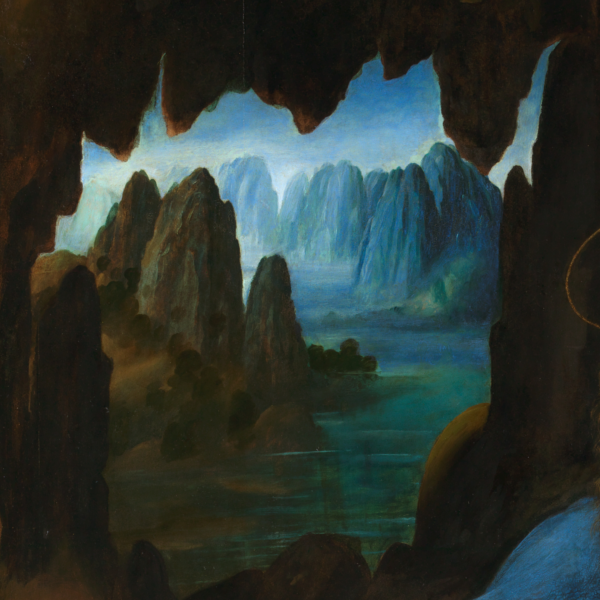 By blocking out most of the sky and surrounding his figures with tall rocky outcrops, overhanging ledges, and dark hollows, Leonardo creates a gloomy environment from which the figures’ faces and bodies emerge as though spot-lit. This unnatural illumination emphasises their divine beauty. In some notes destined for the artist’s manual he was compiling, Leonardo remarked how even the faces of ordinary people look beautiful at dusk when the light is low.