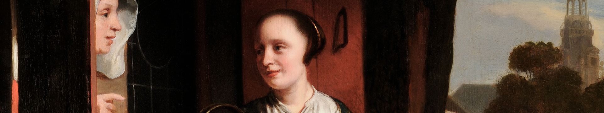 Maes’s most distinctive contribution to genre painting is his highly original series of eavesdroppers. Their appeal lies in the direct manner in which the eavesdropper addresses the viewer, and the intricate interaction between the main and secondary scenes within the same painting.