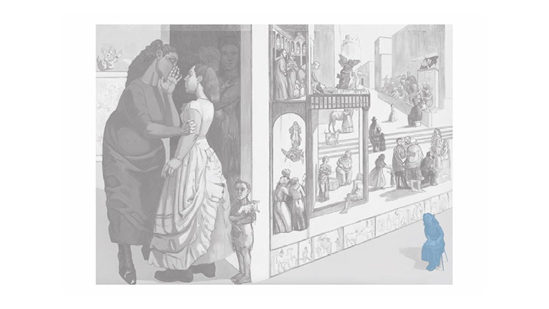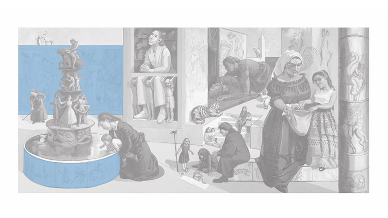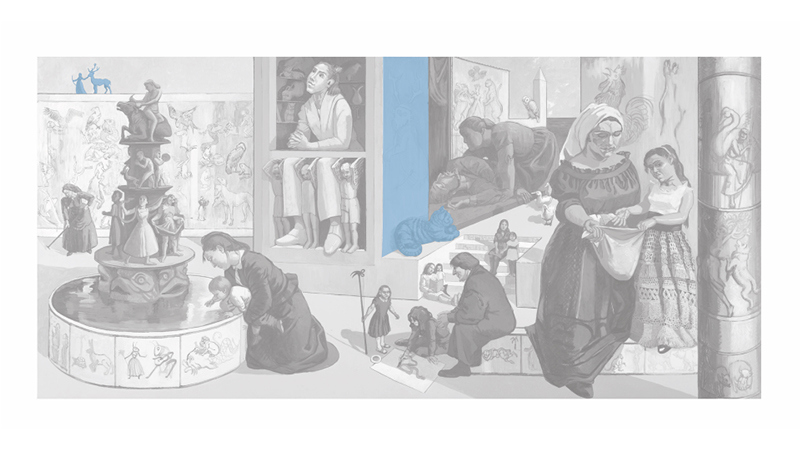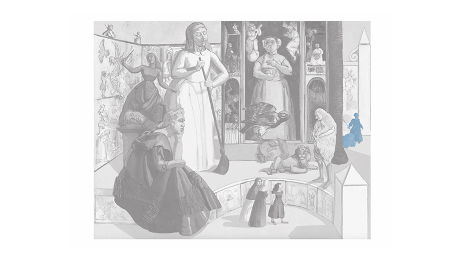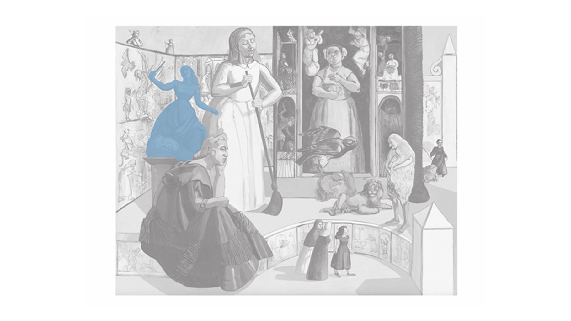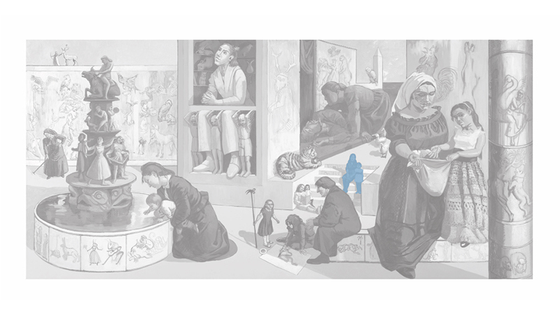 The figure of the Storyteller is based on the likeness of Erika Langmuir, Head of Learning at the National Gallery when Rego was Associate Artist. She peers over a young girl drawing a snake, who is based on Langmuir’s junior colleague, Ailsa Bhattacharya.