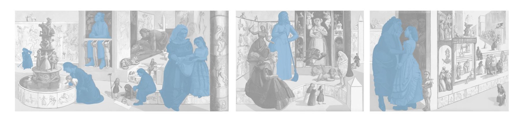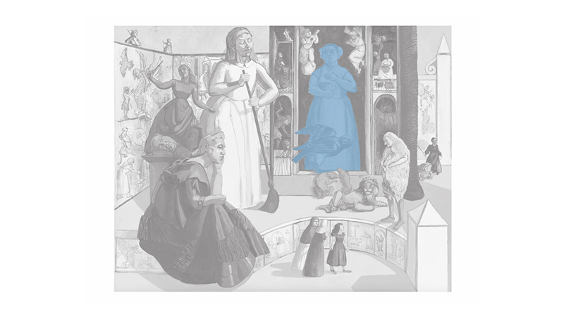 Shaded in blue in the images below are the National Gallery staff, mythological subjects and saints in Rego's garden. Find a short description of each one below.